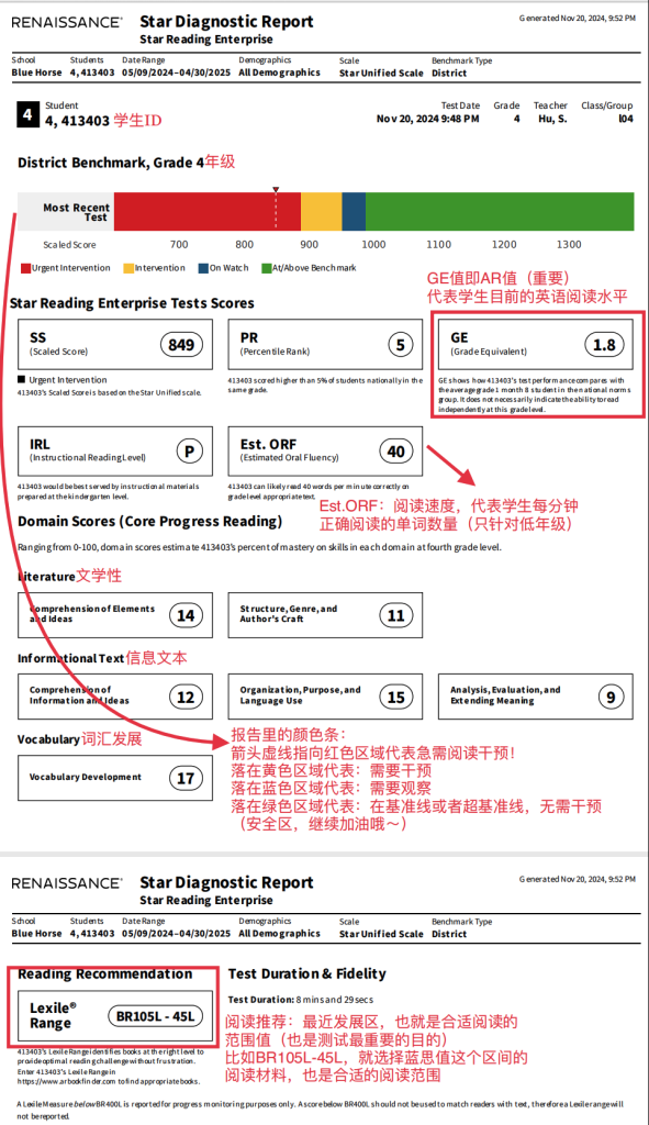 STAR测试可评估学生的阅读年级水平(G.E. Grade Equivalent),并给出不同阅读领域阅读技能分值,以反映学生在美国共同核心州立标准(CCSS)规定的各领域的阅读熟练程度,并提供与之相适应的推荐阅读范围(ZPD)。