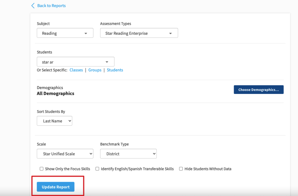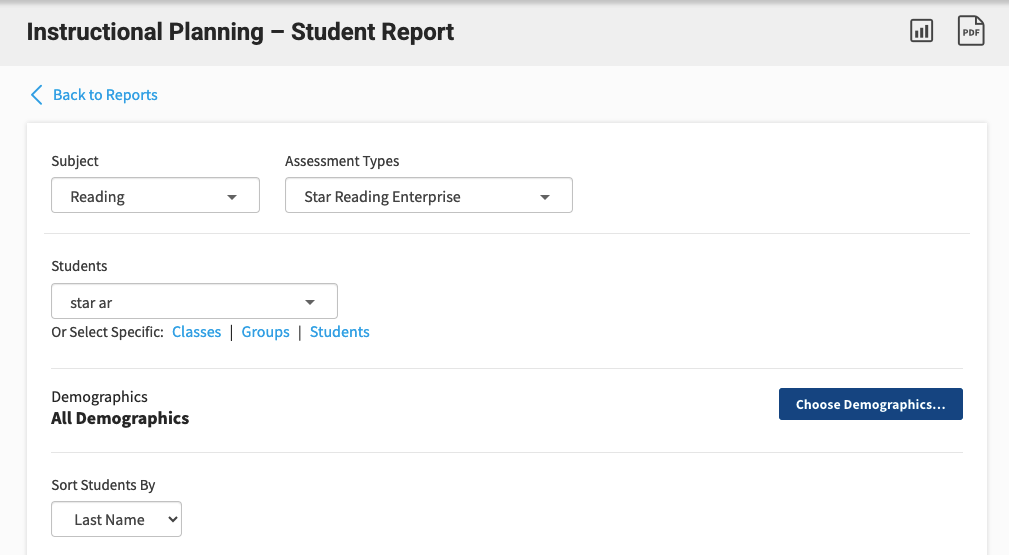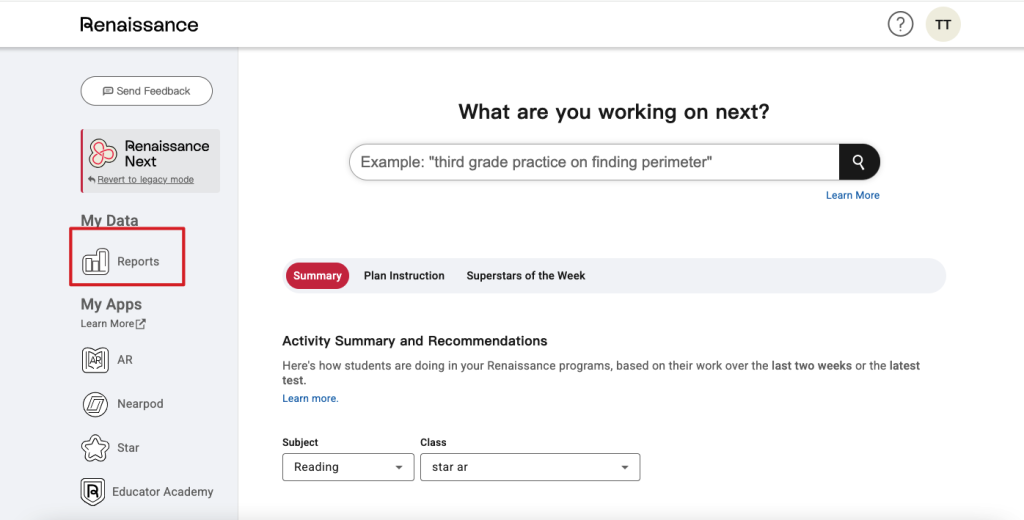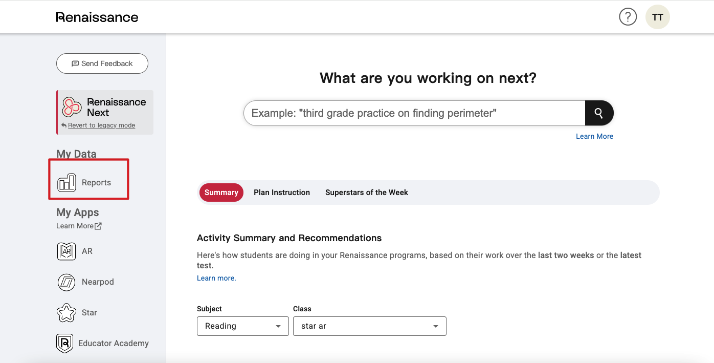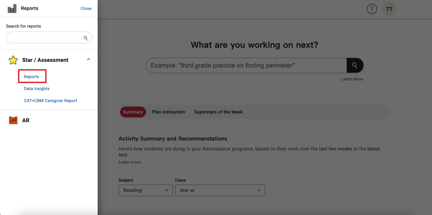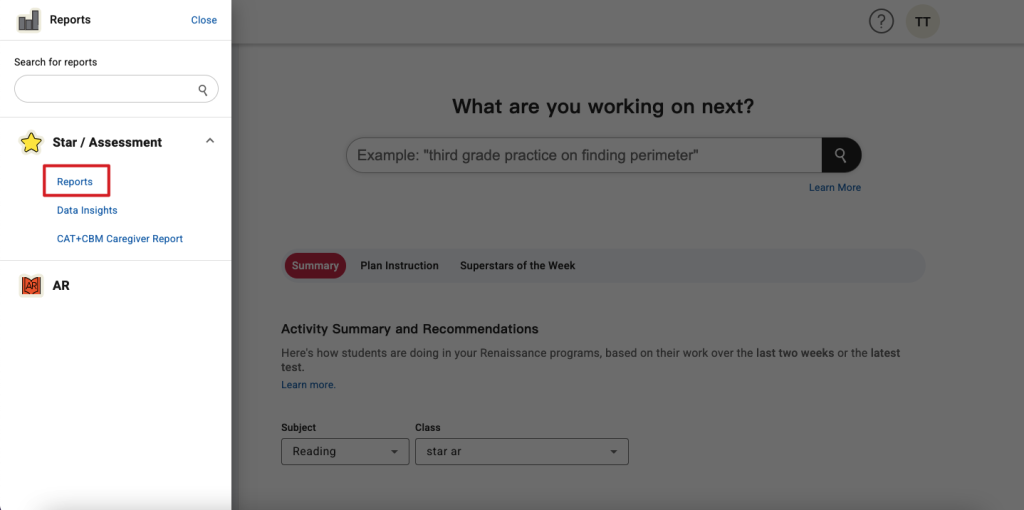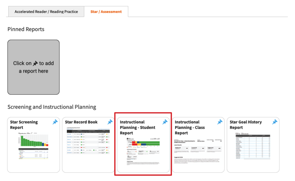 学生账号下完成Star测试后,需要切换到教师账号查看报告。登录教师账号后,点击【Reports】,再选择【STAR图标】>【Reports】。